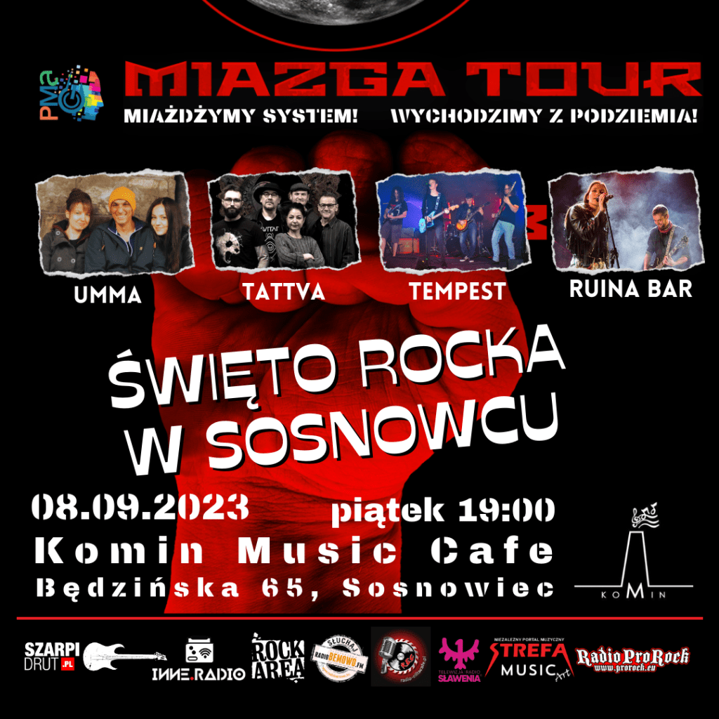 Koncerty MIAZGA TOUR wracają po wakacjach. Już 8 września święto rocka w Klubie Komin Music Cafe w Sosnowcu. Zgrają cztery świetne kapele, wszystkie przyjezdne więc warto je poznać gdyż nie wiadomo, kiedy ponownie przyjadą do Sosnowca. Będzie dobra muza, rock w czystym wydaniu i świetny klimat. Nie może Was zabraknąć!