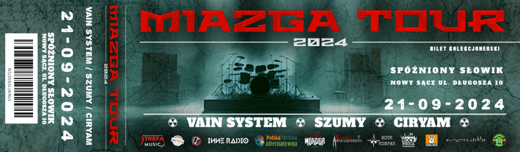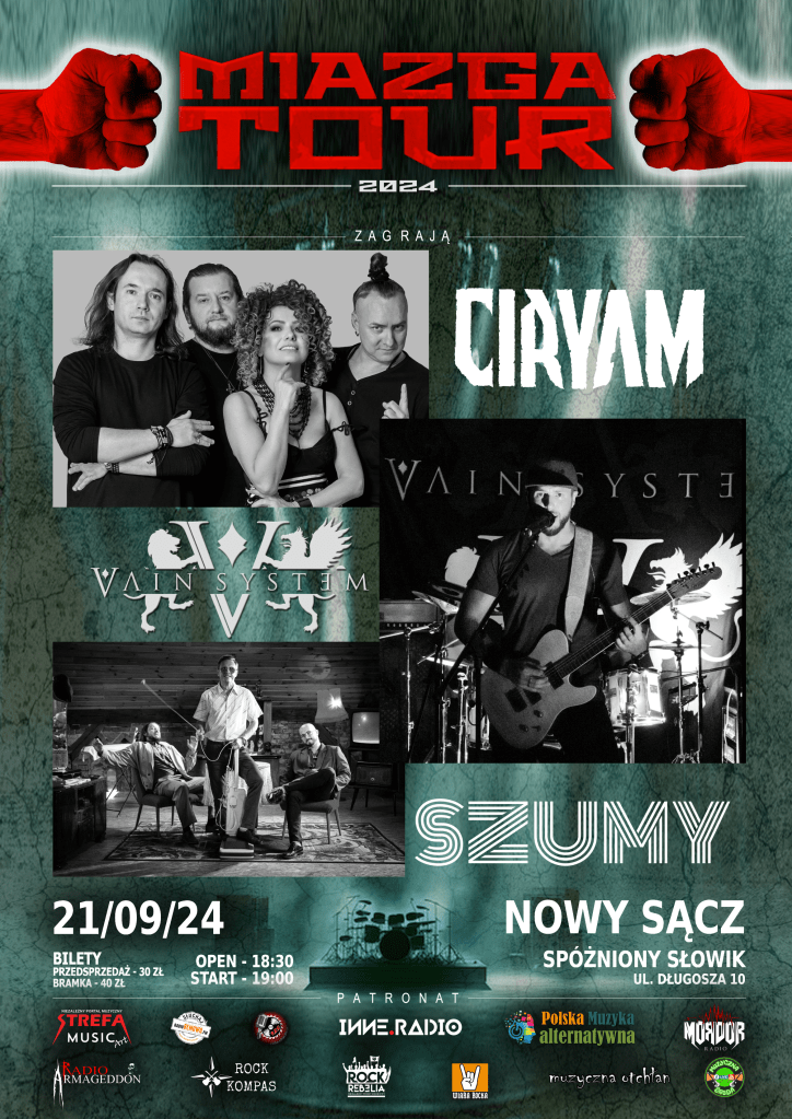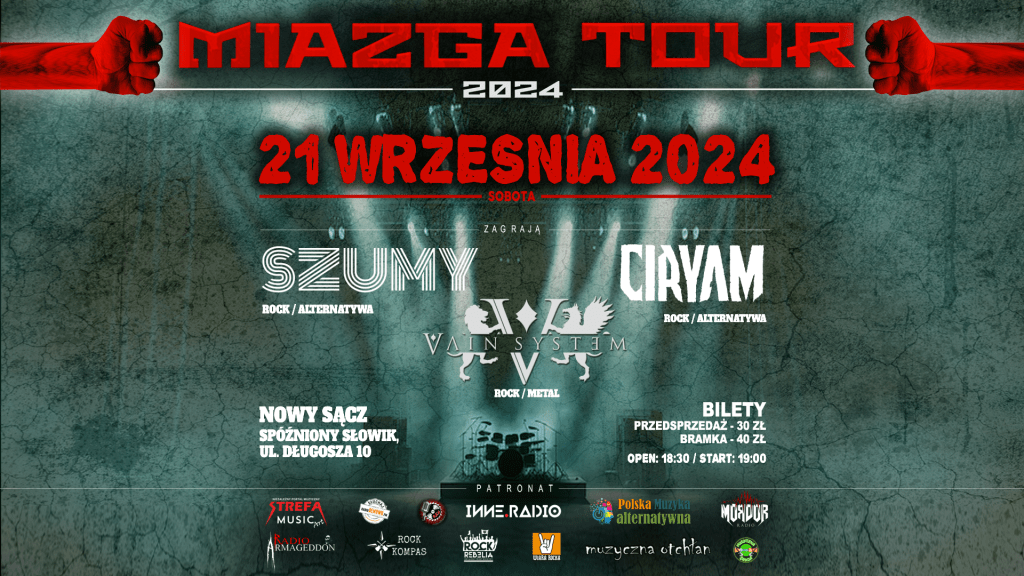 Miazga Tour z Wodzisławia Śląskiego przemieszcza się do Nowego Sącza. Już 21 września 2024 roku w Nowym Sączu w klubie Spóźniony Słowik wystąpią trzy lubiane przez publiczność zespoły – Szumy, Vain System i Ciryam. Ciężkie brzmienia przeplatać się będą z energicznymi solówkami i wpadającymi w ucho refrenami. Będzie dużo ognia, zatem… the stage will burn! Bilety na koncert są już dostępne!