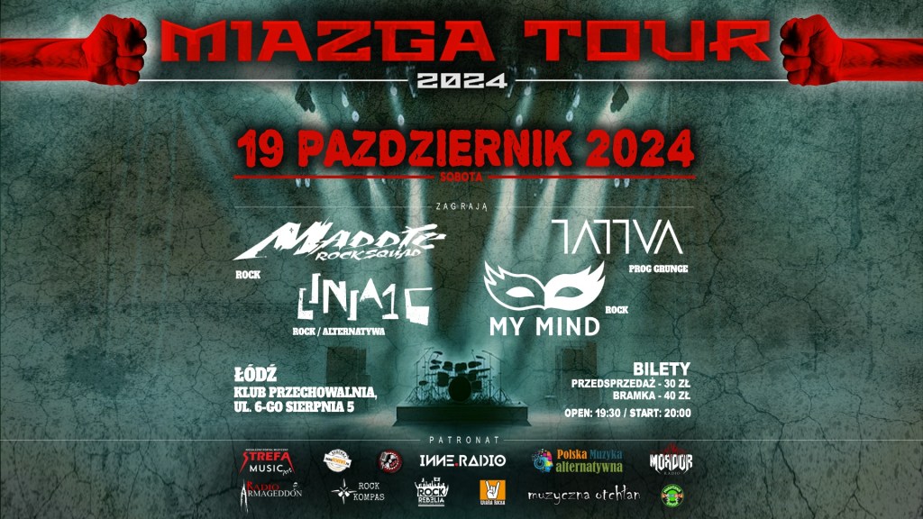Miazga Tour to trasa koncertowa promującą polskie kapele i upowszechniającą polską muzykę niezależną.w To więcej niż tylko koncerty muzyczne – to manifestacja prawdziwego ducha DIY. Od początku stawiamy na własną pracę i zaangażowanie, tworząc coś wyjątkowego. Dla nas to nie tylko wydarzenia muzyczne, ale przede wszystkim okazja do tworzenia wspólnoty, gdzie każdy, bez względu na to czy stoi na scenie czy w tłumie, może poczuć się jak w domu. Projekt łączy różnorodne style muzyczne, od rocka i alternatywy, przez metal i punk rock po elementy elektroniczne. Staramy się stworzyć coś unikalnego i inspirującego dla naszych słuchaczy, a zarazem wyrazić swoją artystyczną wizję. Tego nie da się opisać słowami. Musicie tego doświadczyć sami!