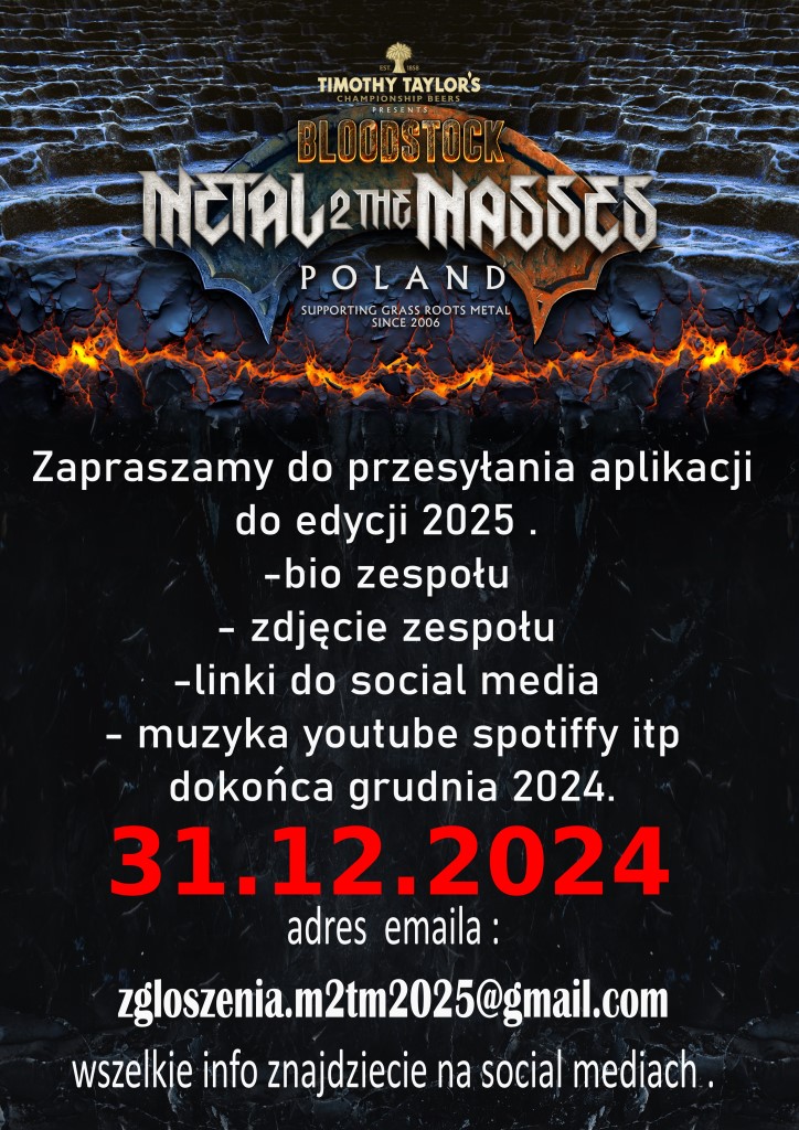 Polska scena metalowa ma kolejną szansę, by zabłysnąć na międzynarodowej arenie! Organizatorzy konkursu Metal 2 The Masses Poland ogłaszają rozpoczęcie naboru zespołów do edycji 2025. Zwycizca tego prestiżowego wydarzenia będzie reprezentował nasz kraj na legendarnym Bloodstock Festival w Wielkiej Brytanii – jednym z największych festiwali metalowych w Europie, na którym występowały takie gwiazdy jak Gojira, Judas Priest, Megadeath, Machine Head czy Behemoth.