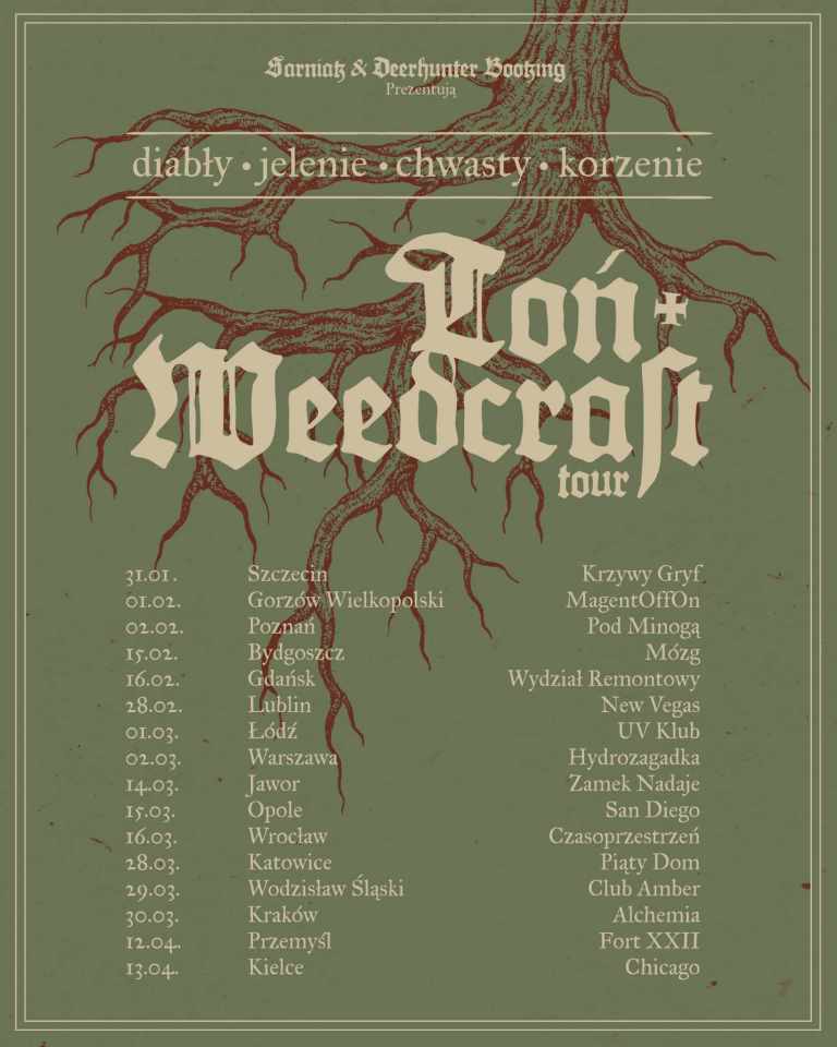 Trasa “Diabły, jelenie, chwasty, korzenie” to 16 koncertów zespołów Toń i Weedcraft. Na trasę zapraszają Sarniak & Deerhunter Booking prezentując listę koncertów od końca stycznia do połowy kwietnia 2025r. Sprzedaż biletów ruszy niebawem.