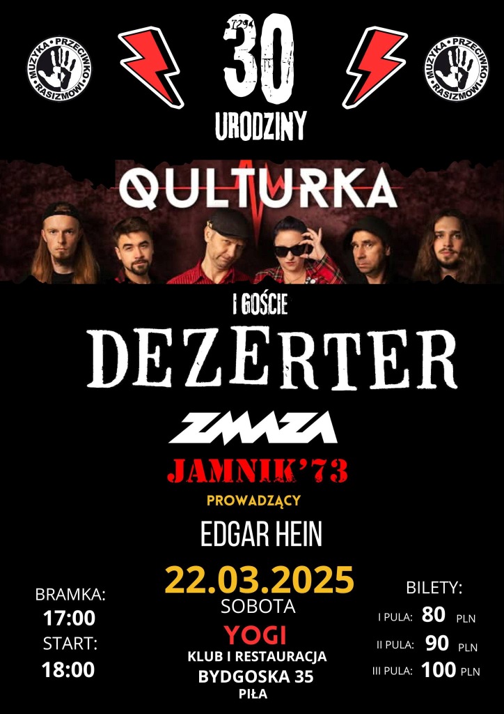 Pod patronatem kampanii społecznej ‘Muzyka Przeciwko Rasizmowi’ Stowarzyszenia ‘NIGDY WIĘCEJ’ odbędzie się koncert z okazji trzydziestolecia działalności zespołu Qulturka. Na zaproszenie jubilatów 22 marca w pilskim klubie Yogi wystąpią również Dezerter, Zmaza i Jamnik ’73.