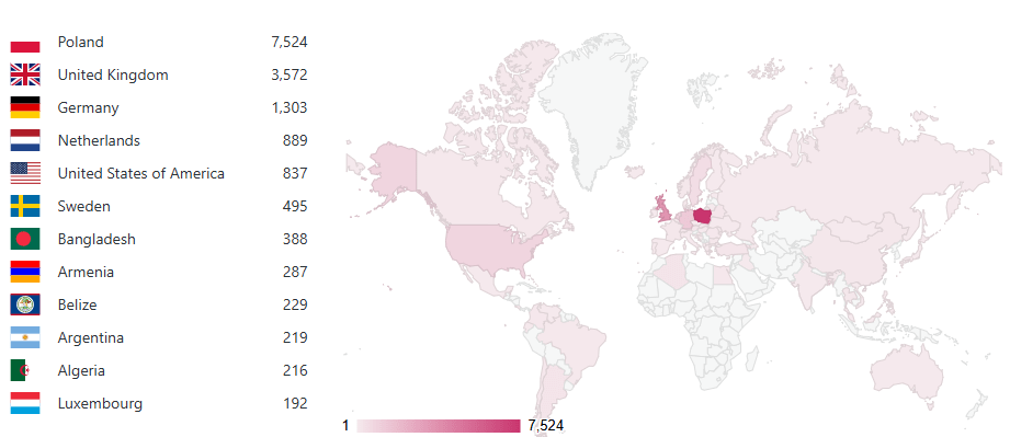 Głosowanie przeszło moje najśmielsze oczekiwania. Przez 3 tygodnie rywalizacji oddano 18,694 głosy! Głosy przychodziły prawie z całego świata, co obserwuję również podczas głosowania na Listę Przebojów TOP30 WaszaMuza ale też wśród odwiedzających niniejszą stronę internetową. To oznacza, że pokazując się w projekcie Polska muzyka alternatywna Wasza twórczość trafia za granice kraju, głównie Europa i Ameryka Północna, zdecydowanie mniej do Ameryki Południowej, Australii i Azji , pozostałe w szczątkowych pojedyńczych wręcz ilościach. Nie jest to dziwne, gdyż pośród naszych fanów są artyści polscy mieszkający w tych krajach, głównie Stany Zjednoczone, UK, Niemcy, Holandia czy Szwecja i tam mają rzesze fanów głosujących na swoich ulubieńców.