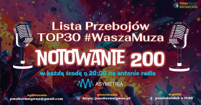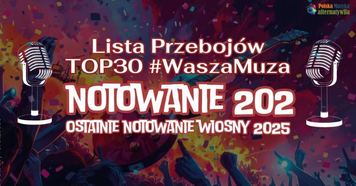 🔊 LISTA PRZEBOJÓW TOP30 #WaszaMuza NOTOWANIE 199 - WYNIKI Zbliża się 200. notowanie Listy Przebojów TOP30 WaszaMuza, które odbędzie się 14.05.2025. Będą niespodzianki dla słuchaczy! W notowaniu 199 najpopularniejszym utworem został "Do dechy wciskam gaz" kapeli Children of Anarchy. Do plebiscytu Singiel Wiosny 2025 nominowano kolejne trzy utwory: KAJOA - "Jaka", Eraspe - "Na koniec świata" i Infernal Codex - "Fog of Forgotten Souls". Na Liście mamy 6 nowości, 8 awansów i 16 spadków. Więcej info na naszej stronie. Głosujcie na nowe kawałki oraz bądźcie z nami na antenie!